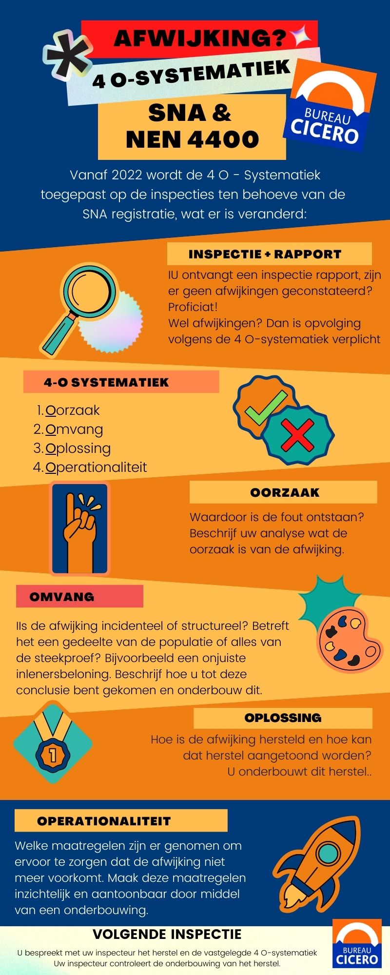 De Stichting Normering Arbeid (SNA) heeft besloten dat met ingang van 1 januari 2022 afwijkingen die betrekking hebben op de steekproef bij NEN 4400 inspecties hersteld gaan worden middels de zogeheten 4 O – Systematiek. Dit past in de doelstelling van de stichting om kwalitatief betere inspecties te organiseren. Door deze methode krijgt u als ondernemer samen met uw inspecteur een beter inzicht in de oorzaak en verbetering van de afwijkingen die zijn vastgesteld. Kortom een geruststelling als u deze systematiek onder de knie heeft. Uiteraard licht uw inspecteur de methodiek toe en heeft het niet als doel om u op te zadelen met een administratieve last.