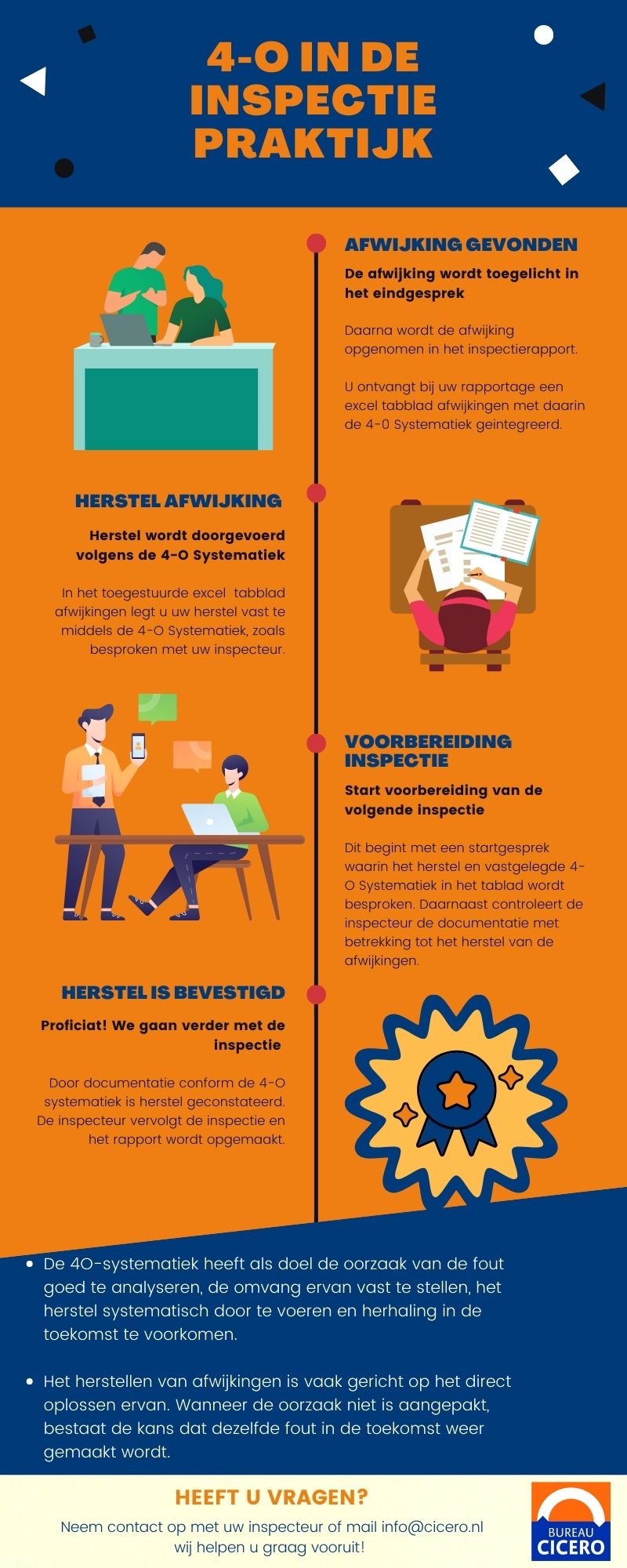 Wat betekent dit nu voor u? Bij een minor of major afwijking hersteld u deze zoals u al gewend was, echter nu conform de 4 O – Systematiek zoals hierboven omschreven. U legt de ondernomen acties vast zodat deze te toetsen zijn voor de inspecteur.